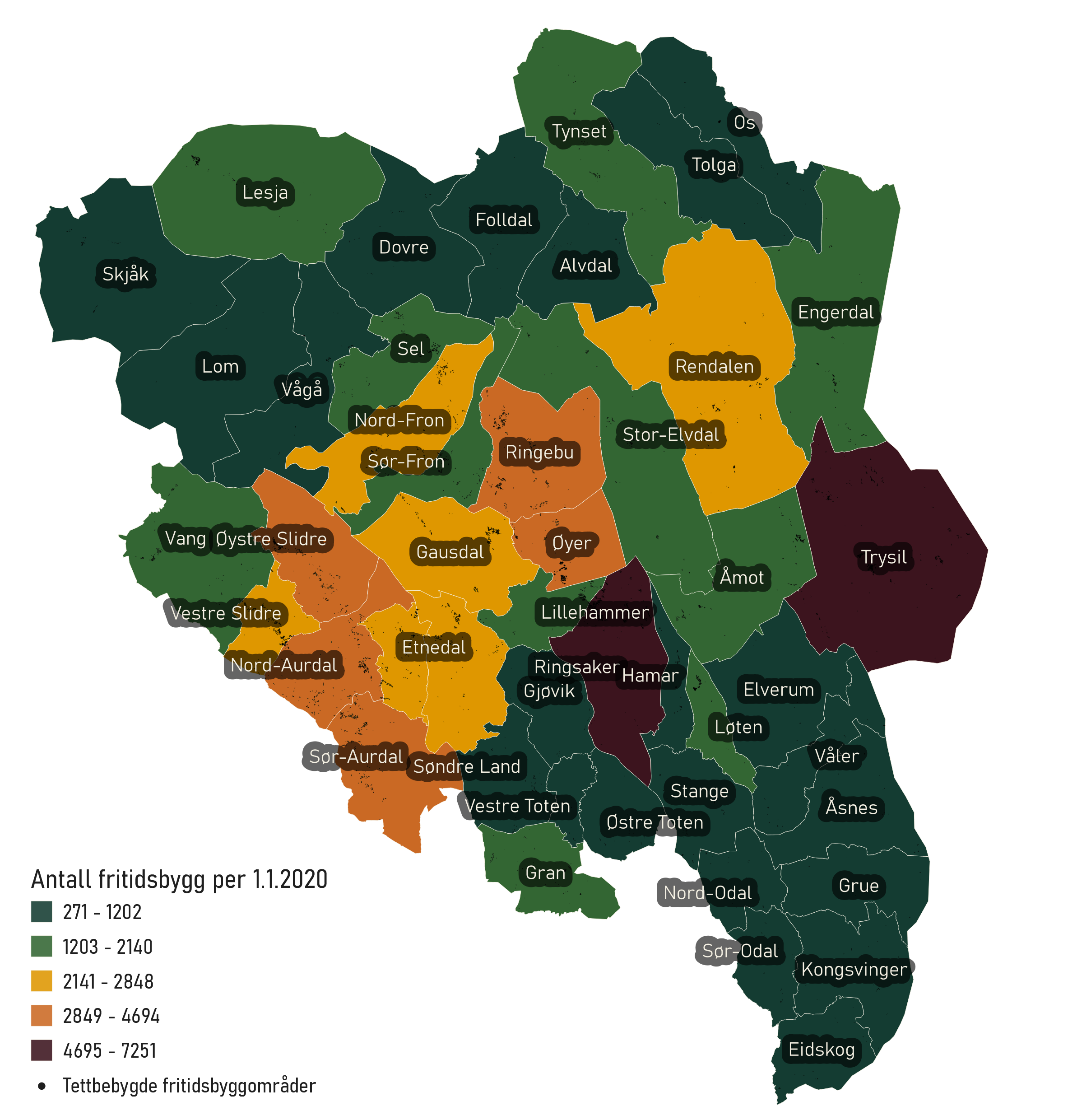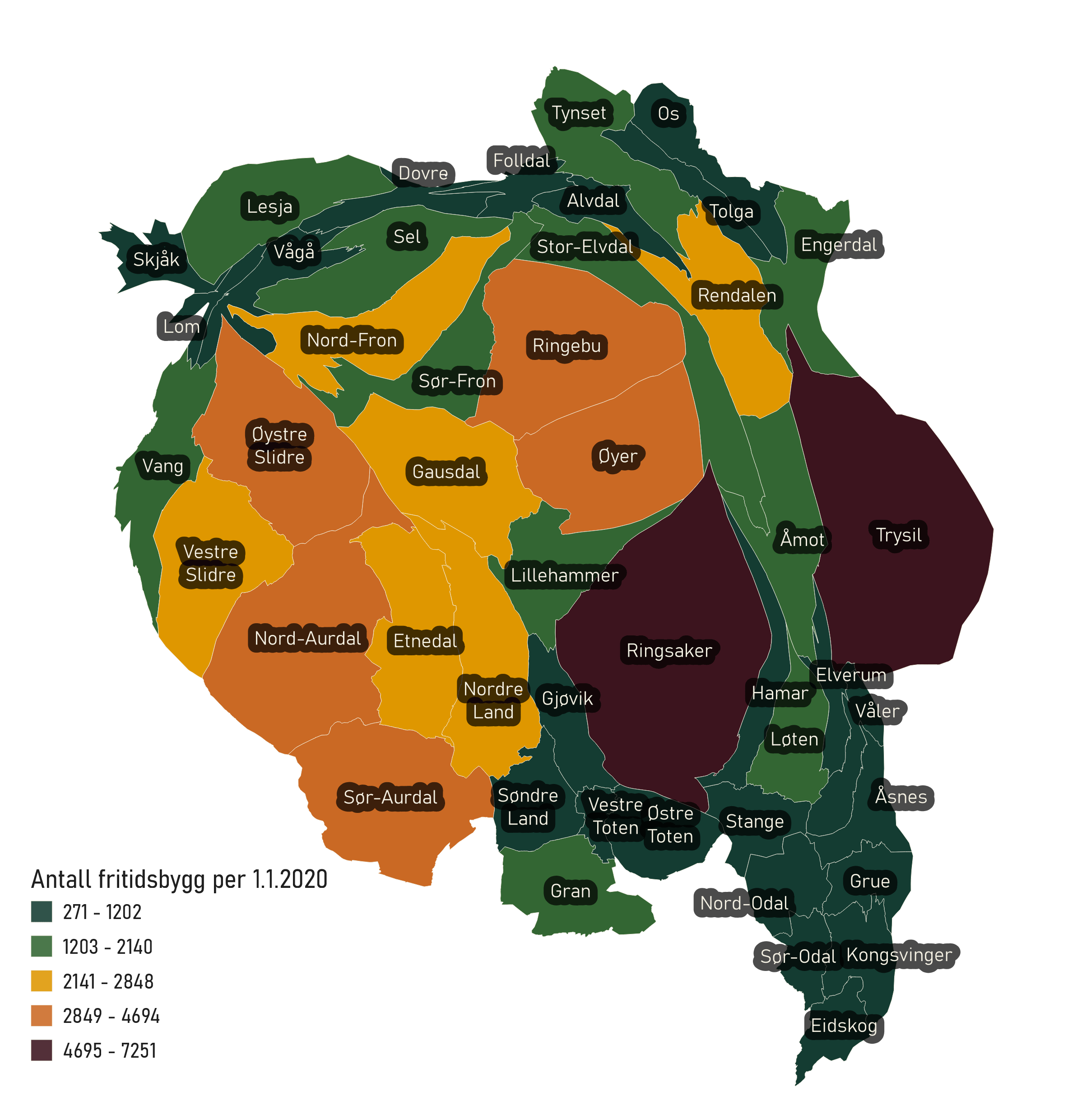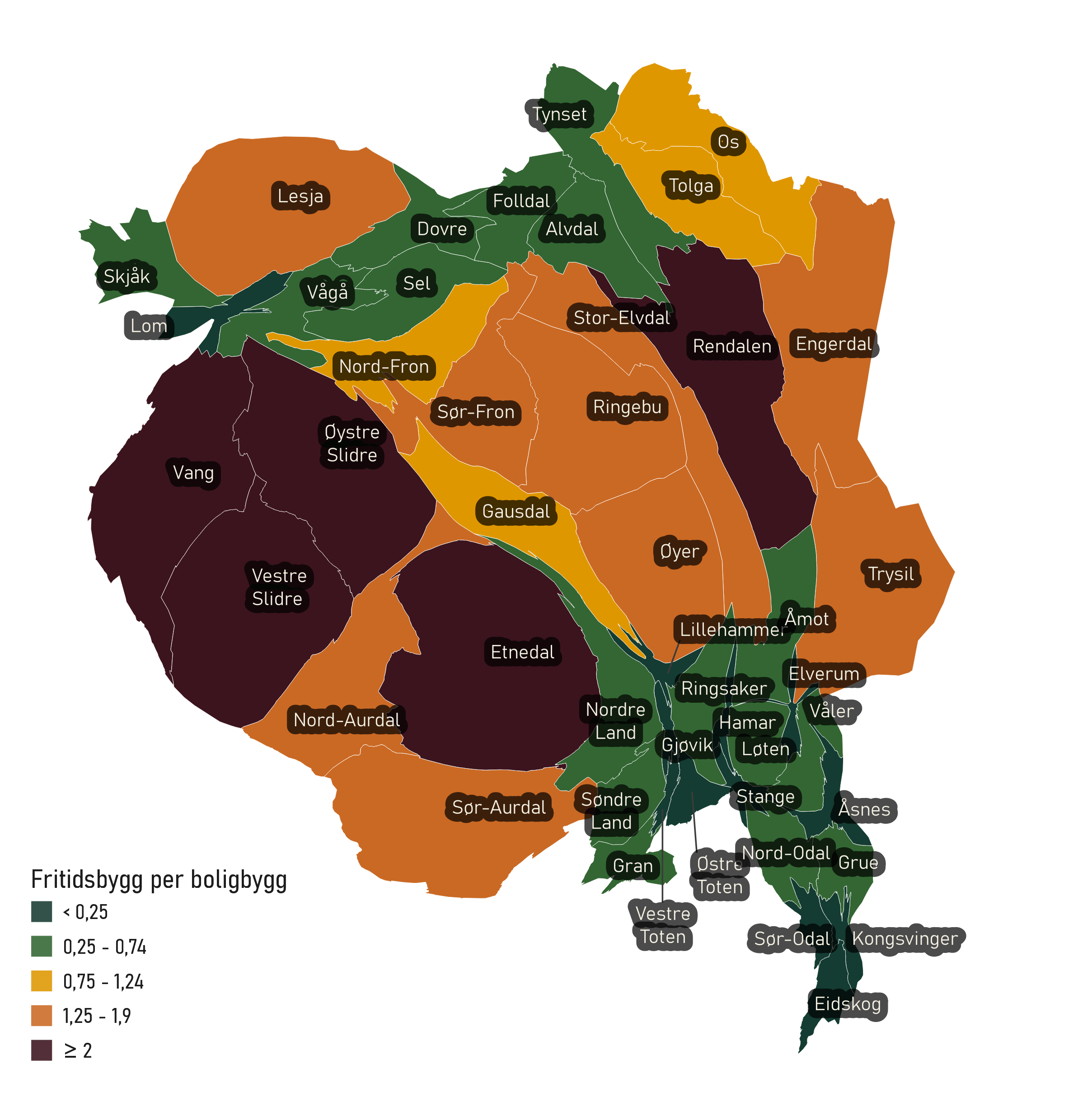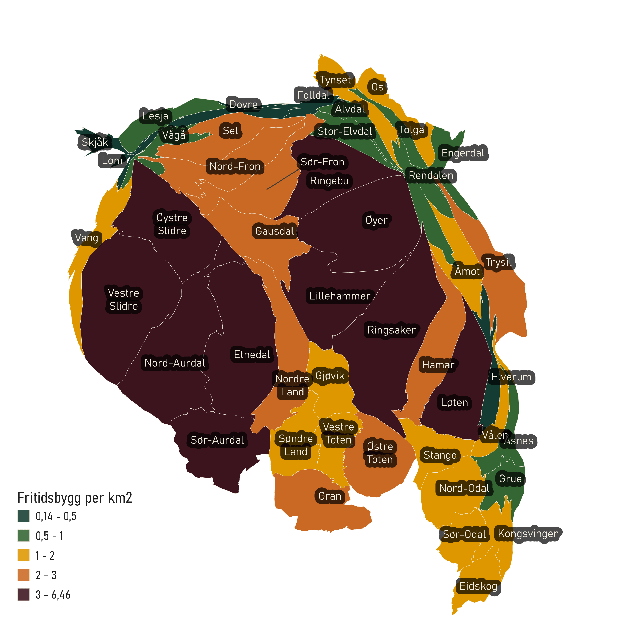 Kommunenes utstrekning i areal varierer. Hvordan ser kartet ut når manipulerer utstrekningen etter antall fritidsbygg per kvadratkilometer? Kommunene markert i lilla har flest fritidsbygg per kvadratkilometer. Fortsatt ligger Ringsaker på topp, som etterfølges tett av Vestre Slidre. De fleste av Valdres-kommunene samt kommunene Lillehammer, Øyer og Ringebu og Løten har alle tre fritidsbygg per kvadratkilometer eller mer. I forrige kart pekte ikke Løten og Lillehammer seg ut med mange fritidsbygg sammenlignet med de andre kommunene, men i dette kartet (som tar høyde for kommunens areal) er de mer fremtredende.